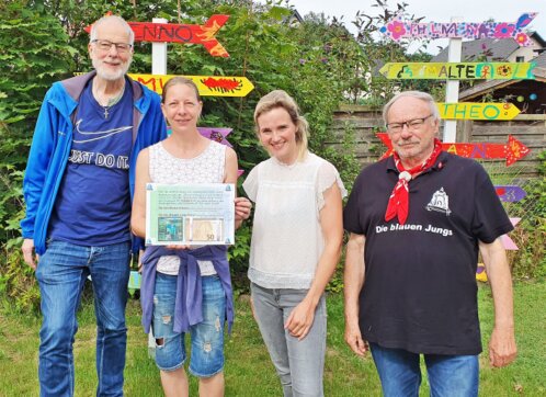 Übergabe an den Kindergarten v.l.n.r.: Bismarckbund Hans Münstermann, 1. Vorsitzender; Johanna Klos, Erzieherin Kita "Kunterbunt"; Frau Gronholz, Vorsitzende des Fördervereins Kindergarten "Kunterbunt"; Carlo Pultke, "Blaue Jungs" Porta